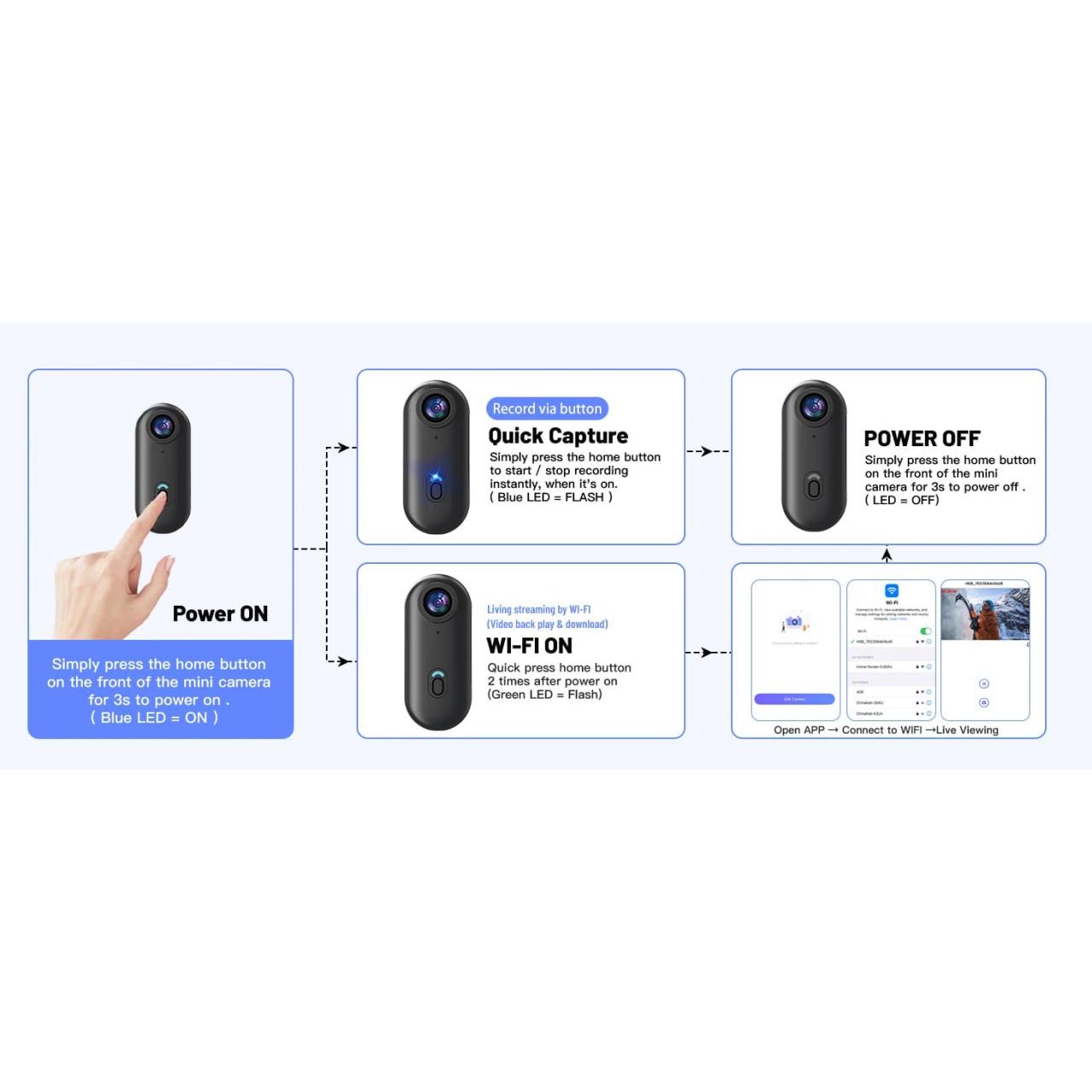 Start or stop recording instantly by pressing the home button once.🔵 Blue LED (Flashing) = Recording